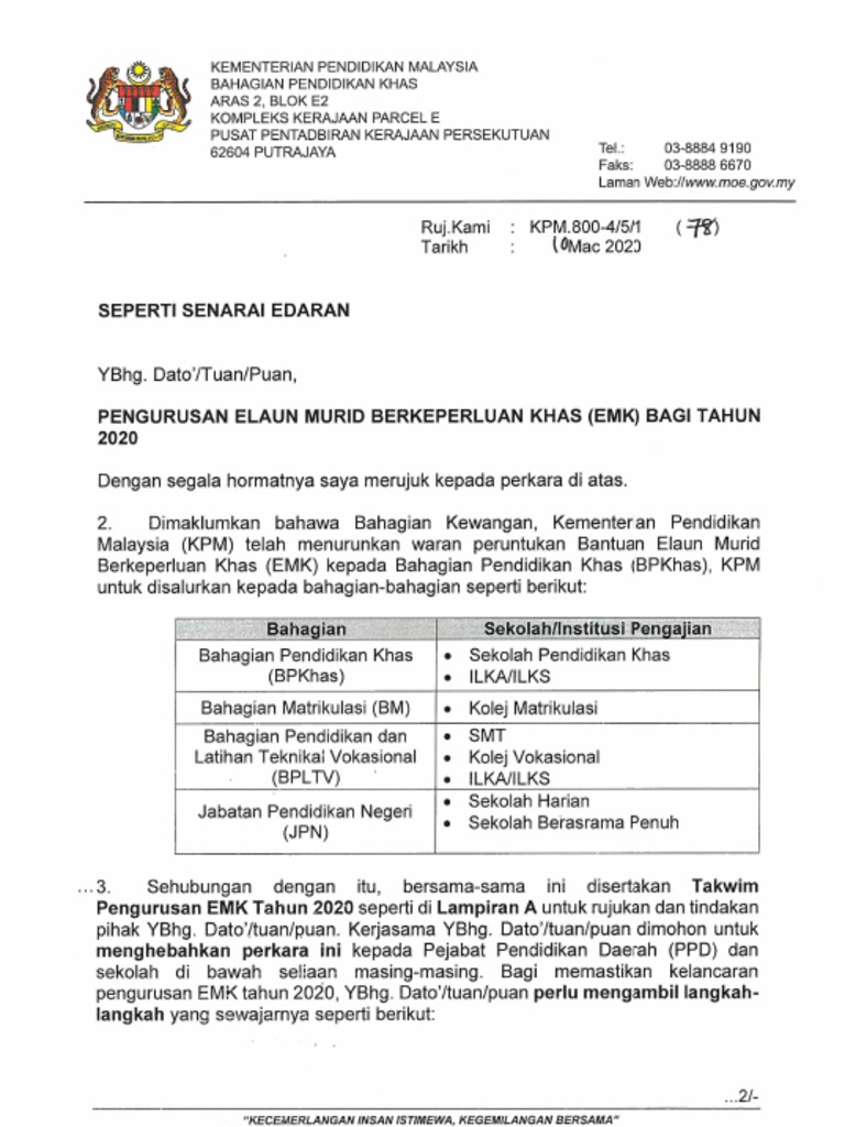 Pengurusan Elaun Murid Berkeperluan Khas Emk Bagi Tahun 2020 Jpn F8c21 Pdf