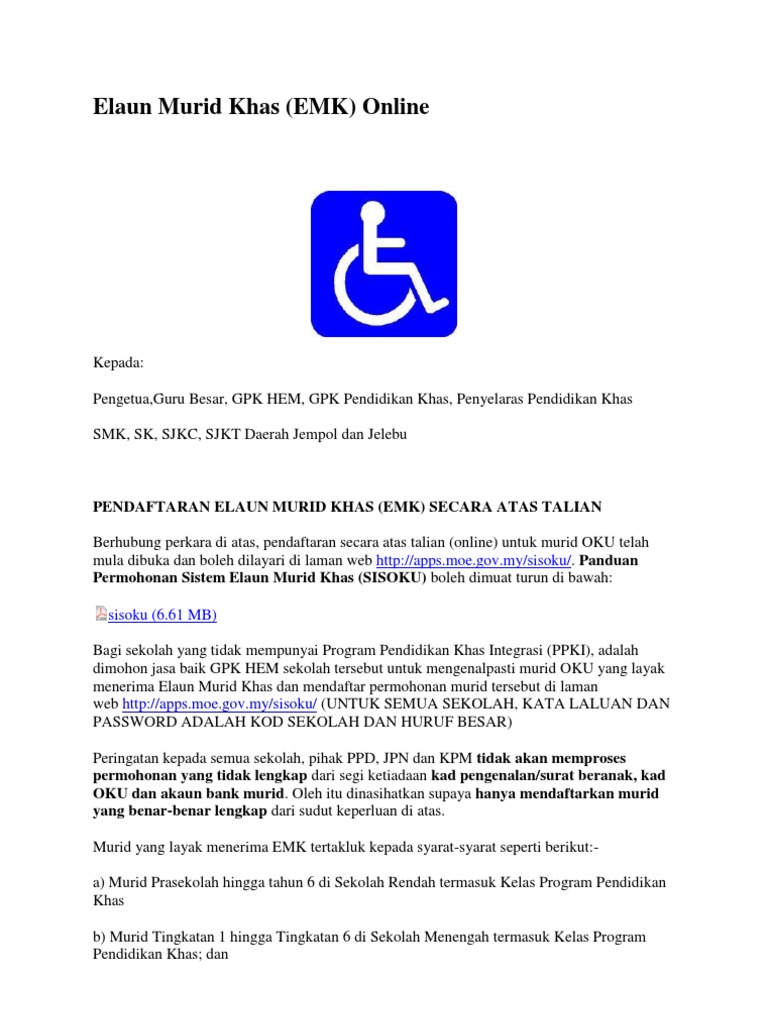. Permohonan EMK secara online-SISOKU Oleh sekolah. Garis Panduan Pengurusan Elaun Murid Berkeperluan Khas EMK Tahun 2019. Pindaan Perenggan 51 dan 71 Surat Pekeliling Kewangan Bil2 Tahun 2018 Mengenai Pengurusan Elaun Murid.