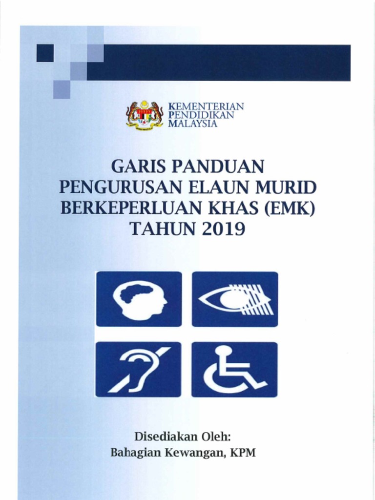 Sila klik pada pautan di bawah untuk memuat turun Garis Panduan Pengurusan Elaun Murid Berkeperluan Khas EMK Tahun 2019 dan Pindaan Perenggan 51 dan 71 -. Pada tahun 2018 pemprosesan EMK hanya akan dilakukan SEKALI sahaja. Elaun ini diberikan kepada murid OKU yang bersekolah di peringkat prasekolah sekolah rendah sekolah menengah termasuk pelajar.